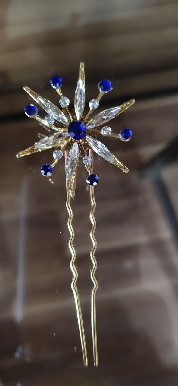 Juego de dos horquilla de latón con cristal tallado, se puede cambiar el color del cristal, en observaciones puedes poner el color que te gustaría. Se pueden bañar en oro o en plata, elige la opción que más te combine o guste.